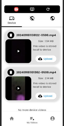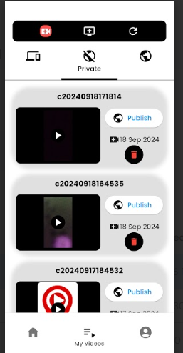 Find your uploaded videos: After uploading is complete, your videos will be stored in the “private” section of the app.